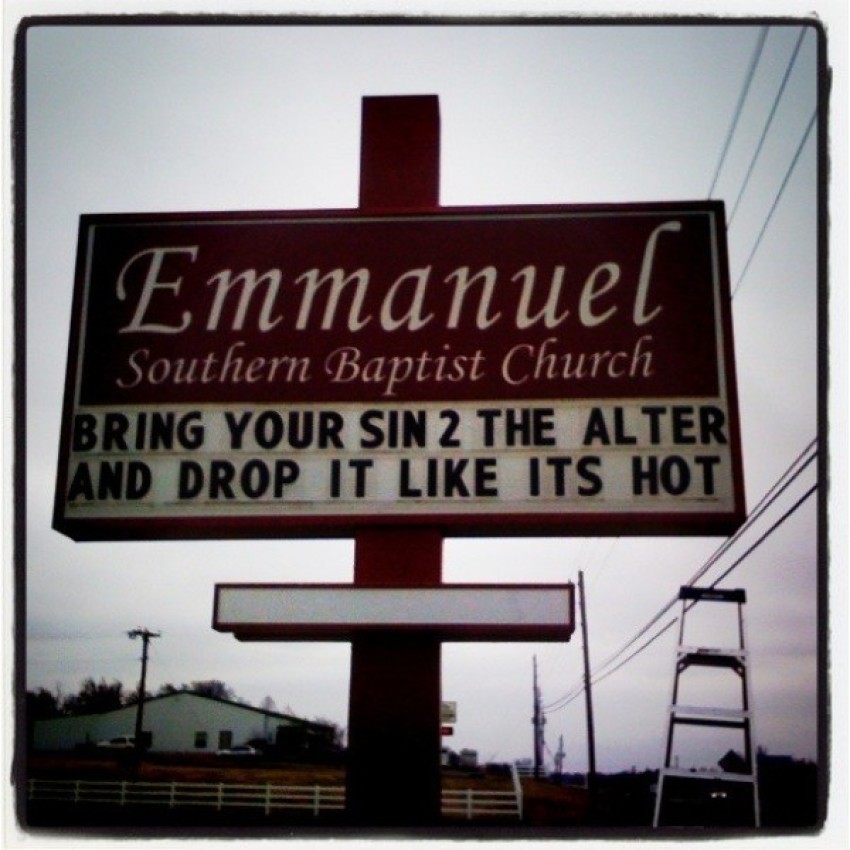 The sign in front of the Emmanuel Southern Baptist Church states: “BRING YOUR SIN 2 THE ALTER AND DROP IT LIKE ITS HOT”