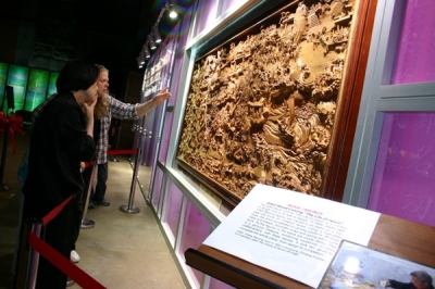 Observers view a giant wood carving depicting the life of Jesus through 75 detailed scenes near the entrance of the exhibition. The Bible Exhibition of the Church in China runs until June 12. (Photo: The Christian Post)