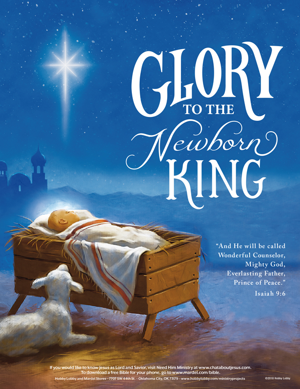 Hobby Lobby, a faith-based arts and crafts store with more than 1,000 locations across the U.S., has published a Christmas message reading “Glory to the Newborn King” in newspapers nationwide. The advertisement, unveiled last week, features a picture of baby Jesus lying in a manger as a lamb looks up at Him. A star shines in the town of Bethlehem, which appears in the night sky in the background.