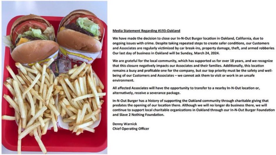"We have made the decision to close our In-N-Out Burger location in Oakland, California, due to ongoing issues with crime,” said Denny Warnick, In-N-Out’s chief operating officer, in a statement. “Despite taking repeated steps to create safer conditions, our Customers and Associates are regularly victimized by car break-ins, property damage, theft, and armed robberies.”