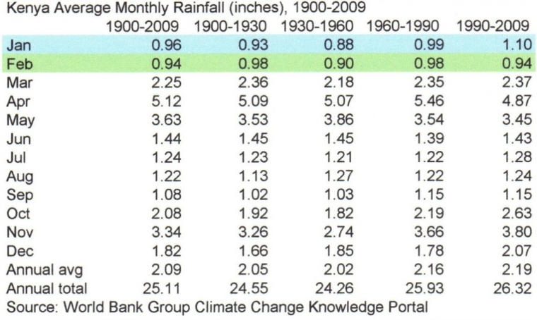 And the hard data in the table below show that, while rainfall amounts have risen and fallen in Kenya since 1900, there is no significant trend.