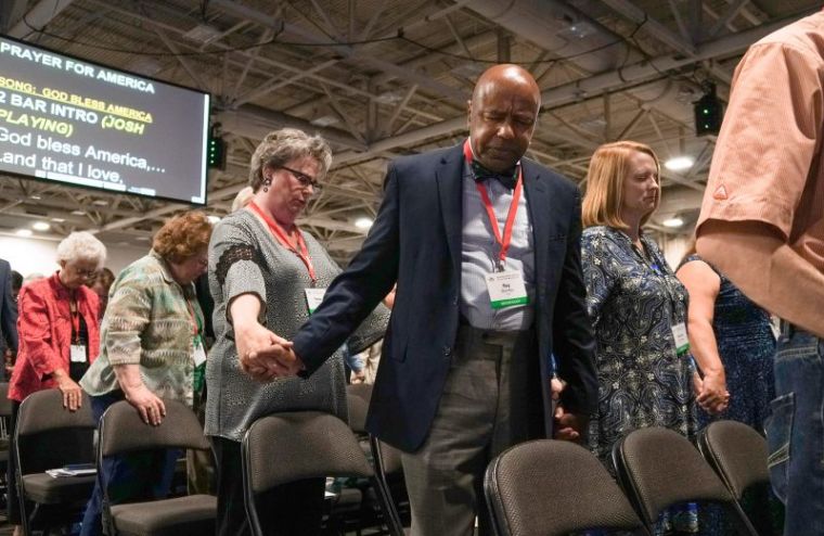 Ray Brantley, a messenger from Texas, front, prays for unity June 12, during the first session of the two-day Southern Baptist Convention's annual meeting at the Kay Bailey Hutchison Convention Center in Dallas, Texas, on June 12, 2018. | (Photo: Adam Covington/SBC)