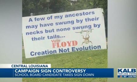 A Louisiana candidate running for a district seat at Rapides Parish School Board has taken down a pro-Creationism sign for his campaign after it drew considerable controversy.