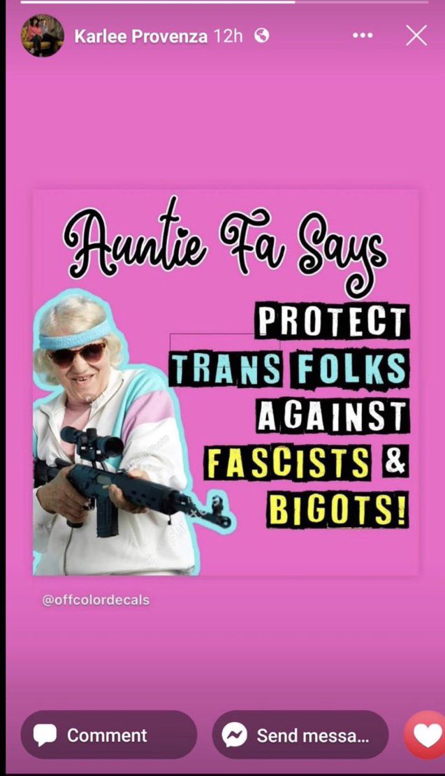 Democratic state Rep. Karlee Provenza, the House minority whip, shared a meme Friday on social media during the "Transgender Day of Visibility." The meme showed an elderly woman in an athletic jacket with the colors of the trans flag and a caption reading, "Auntie Fa says, Protect Trans Folks Against Facists & Bigots!"