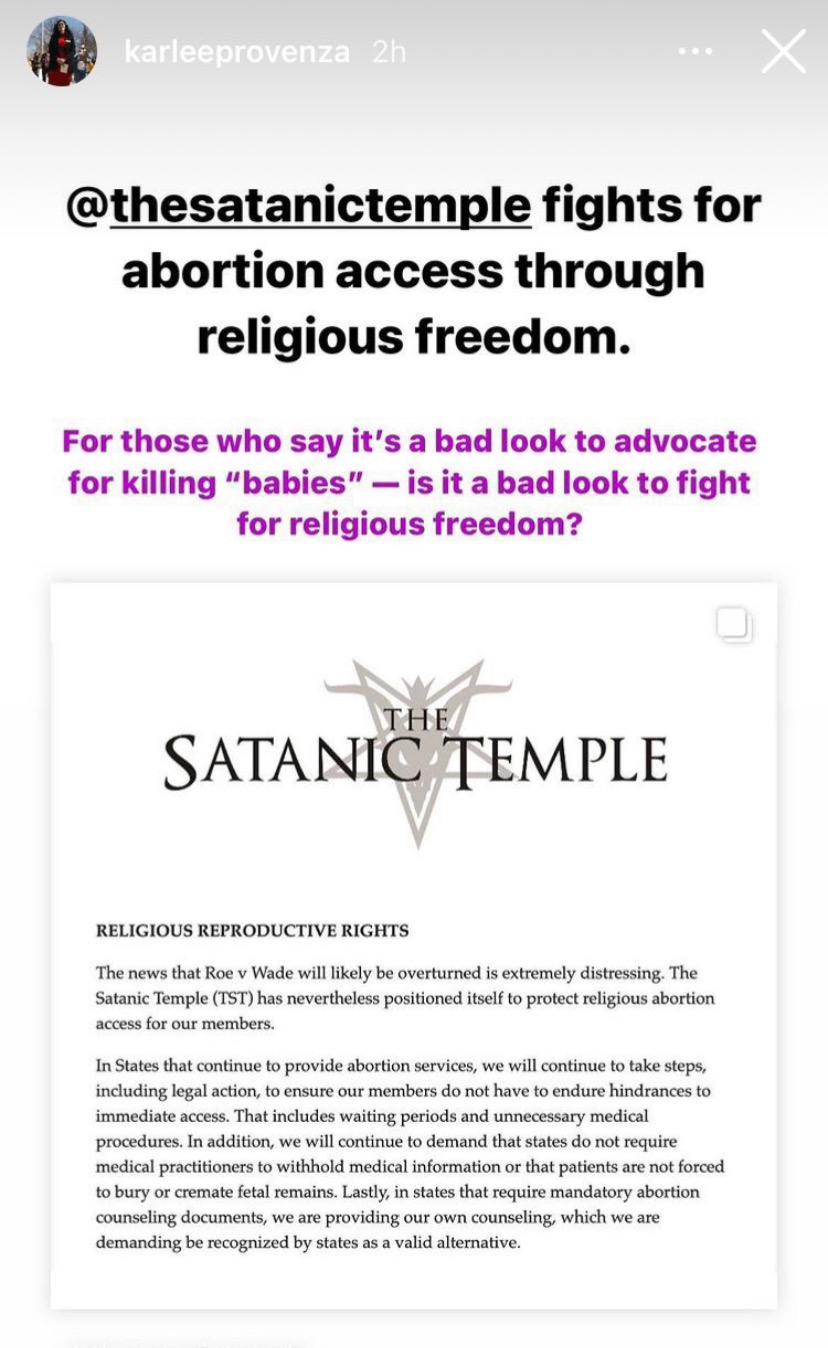 Before posting the "Auntie Fa" meme, Provenza shared another undated post claiming The Satanic Temple (TST) "fights for abortion access through religious freedom" with a statement from TST calling last June's Dobbs decision "extremely distressing."